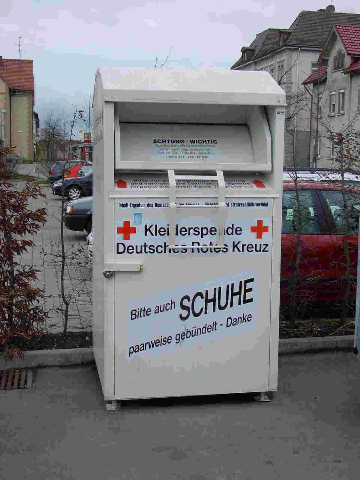 Altkleider - Container Altkleider - Sammlung Der Ortsverein sammelt in Bad Saulgau und deren Teilgemeinden das ganze Jahr über Altkleider. Zu einem findet einmal im Jahr eine Strassensammlung statt und zum anderen stehen das ganze Jahr Altkleidercontainer im Stadtgebiet verteilt bereit. Die gesammelten Altkleider werden teilweise innerhalb des DRK wiederverwendet (Kleiderkammer, Katastrophenschutz im Ausland, ...) und teilweise an wiederverwertende Abnehmer weiterverkauft. Die durch den Verkauf entstehende Erlöse fliessen ausschliesslich der gemeinnützigen Arbeit des Roten Kreuzes im Kreisverband Sigmaringen wieder zu! |